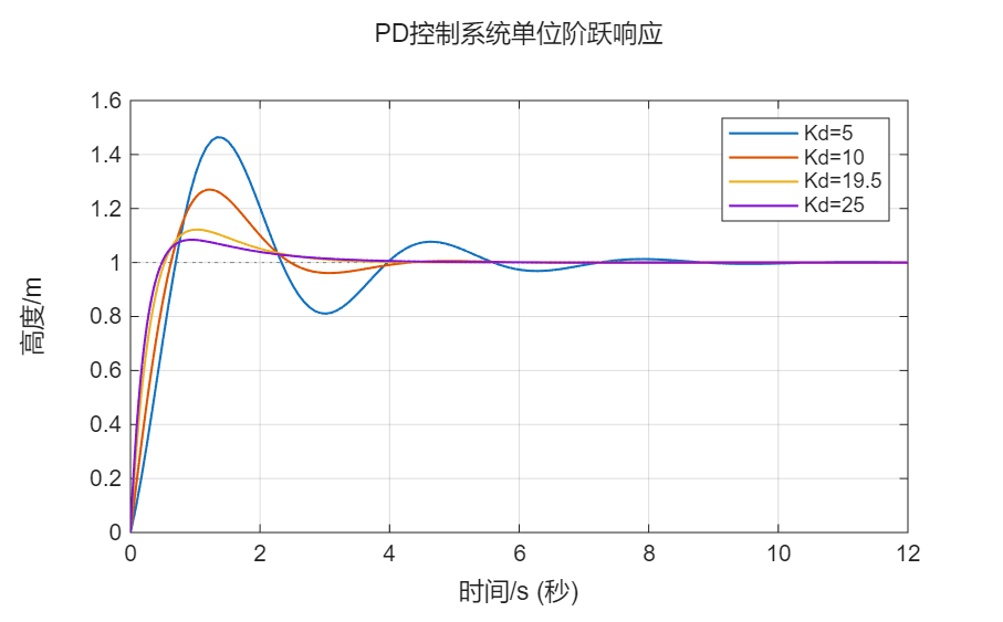 运行代码,分别绘制当\(K_d=5,K_d=10,K_d=19.5,K_d=25\)时系统的单位阶跃响应。
