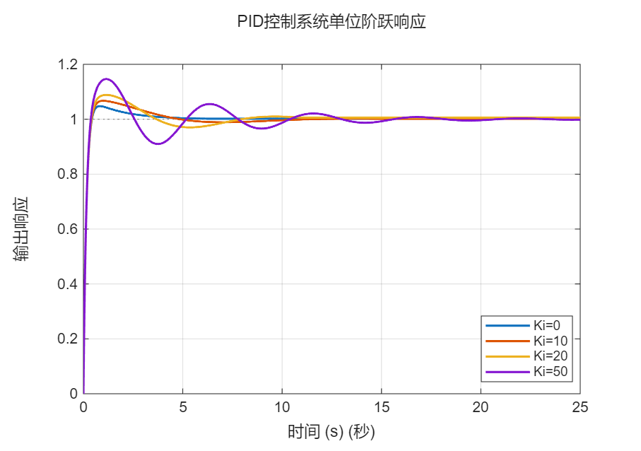 运行得到如上图所示的图像。可以发现,随着\(K_i\)的增大,系统并不会变得更加稳定,反而会变得更加不稳定。当\(K_i>141.856\)时,系统的闭环特征方程根会出现在右半平面上,此时系统是发散的。