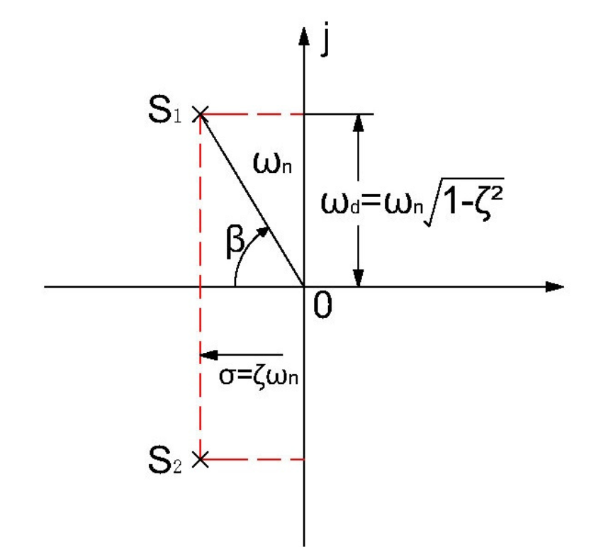 而上升时间\(t_r\)与阻尼角\(\beta\)和有阻尼振荡频率\(\omega_d\)有关,根据公式\(t_r=\frac{\pi-\beta}{\omega_d}\)可知:为使系统响应尽可能快,则上升时间要尽可能小,所以阻尼角和无阻尼振荡频率要尽可能大。根据图6所示的欠阻尼二阶系统的特征参量可以很容易发现,我们需要让闭环特征根虚部的绝对值尽可能大。