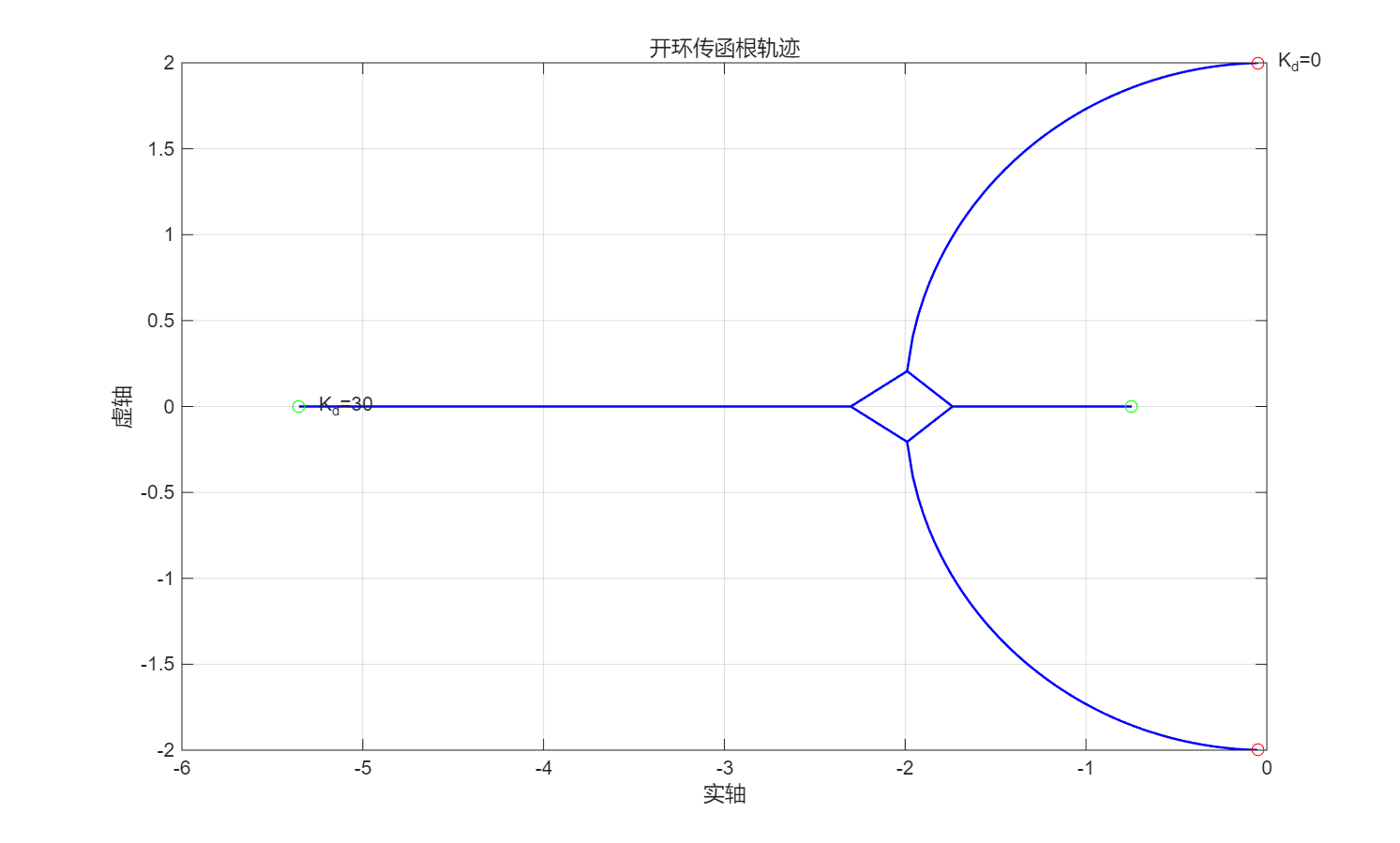 观察上图会发现在分离点附近出现一个菱形,实际上这是\(K_d\)精度不足导致的。精度为\(100\)时候步长较大,在分离点附近跨过了分离点的值。为了根轨迹看上去更加美观,可以尝试提高精度。当精度