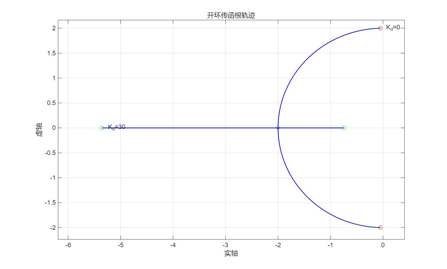 为了绘制根轨迹,需要参数化遍历\(K_d\),逐个计算闭环特征方程的极点并在复平面上绘制。需要编写以下代码: